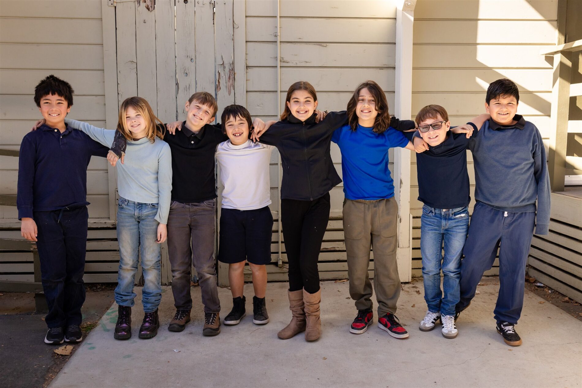 Kavod students lined up outside, standing shoulder-to-shoulder with their arms around each other, smiling at the camera.